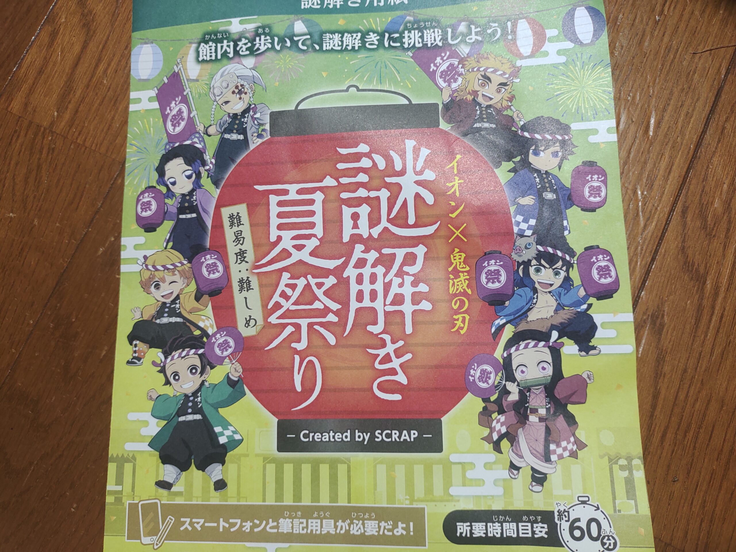2025年8月12日 / 最終更新日時 : 2025年8月12日 ohashi 日記 イオン鬼滅の刃謎解き夏祭り イオンモールで開催されている鬼滅の刃の謎解きに行ってきました。前回の第一段に続き無料で参加できるので夏休みのお子さんなどがチャレンジしてました。 今回はヒントなしでクリア Follow me! @sawanthai 関連 FacebookXBlueskyHatenaCopy